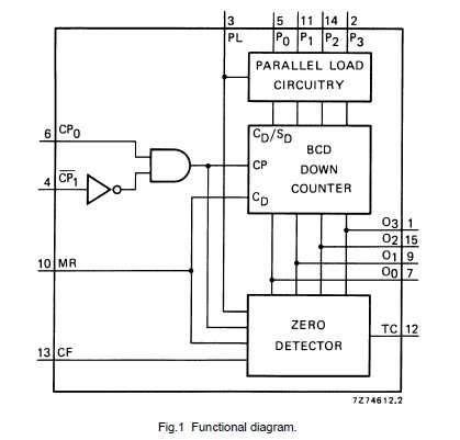 The HEF4522BP is a synchronous programmable 4-bit BCD down counter with an active HIGH and an active LOW clock input, an asynchronous parallel load input, (PL), four parallel inputs (P0 to P3), a cascade feedback input (CF), four buffered parallel outputs, a terminal count output (TC) and an overriding asynchronous master reset input (MR). The HEF4522BP is a programmable, cascadable down counter with a decoded TC output for divide-by-n applications.