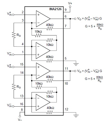 INA126UA features: (1)Low quiescent current: 175μA/chan.; (2)Wide supply range: ±1.35V to ±18V; (3)Low offset voltage: 250μV max; (4)Low offset drift: 3μV/℃ max; (5)Low noise: 35nV/√Hz; (6)Low input bias current: 25nA max; (7)8-PIN DIP, SO-8, MSOP-8 surface- mount. Dual: 16-Pin DIP, SO-16, SSOP-16.