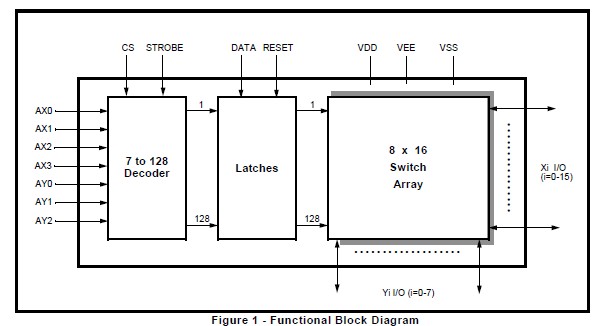 The MT8816AP is fabricated in MITEL ISOCMOS technology providing low power dissipation and high reliability. The MT8816AP contains a 8 x 16 array of crosspoint switches along with a 7 to 128 line decoder and latch circuits. Any one of the 128 switches can be addressed by selecting the appropriate seven address bits. The selected switch can be turned on or off by applying a logical one or zero to the DATA input. The applications of the MT8816AP include: Key systems, PBX systems and so on.