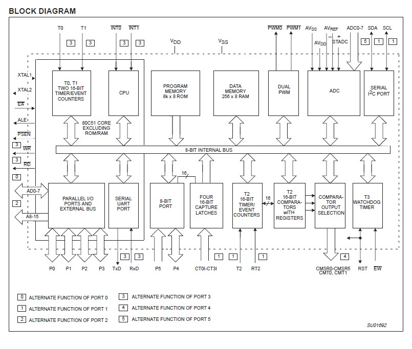 The P80C552IBA/08 Single-Chip 8-Bit Microcontroller is manufactured in an advanced CMOS process and is a derivative of the 80C51 microcontroller family. The P80C552IBA/08 contains a non-volatile 8k × 8 read-only program memory, a volatile 256 × 8 read/write data memory, five 8-bit I/O ports, one 8-bit input port, two 16-bit timer/event counters (identical to the timers of the 80C51), an additional 16-bit timer coupled to capture and compare latches, a 15-source, two-priority-level, nested interrupt structure, an 8-input ADC, a dual DAC pulse width modulated interface, two serial interfaces (UART and I2C-bus), a “watchdog” timer and on-chip oscillator and timing circuits. For systems that require extra capability, the P80C552IBA/08 can be expanded using standard TTL compatible memories and logic.