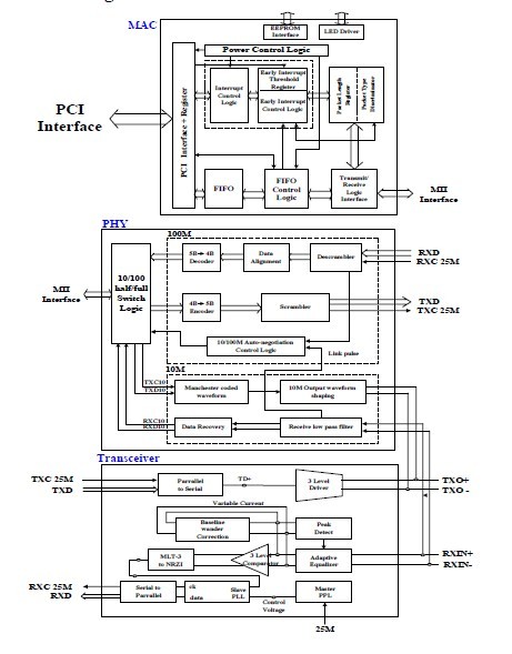 RTL8101E features: (1)100pin QFP/LQFP; (2)Integrated fast etherner MAC, physical chip and transceiver in one chip; (3)10Mb/s and 100Mb/s operation; (4)Supports 10Mb/s and 100Mb/s N-way auto-negotiation operation; (5)PCI local bus single-chip fast ethernet controller; (6)Supports 25MHz crystal or 25MHz OSC as the internal clock source. The frequency deviation of either crystal or OSC must be within 50 PPM.; (7)Compliant to PC99/PC2001 standard; (8)Supports wake-on-lan function and remote wake-up; (9)Supports 4 wake-on-lan(WOL)signals; (10)Supports auxiliary power-on internal reset, to be ready for remote wake-up when main power still remains off.