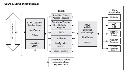 S5935QF features: (1)PCI 2.1 Compliant Master/Slave Device; (2)Full 132 Mbytes/sec Transfer Rate; (3)Supports new Intel 440BX/GX Chipsets; (4)Supports new WinNT Service Pack 2 and 3; (5)PCI Bus Operation DC to 33 MHz; (6)8/16/32 Bit Add-On User Bus; (7)Four Definable Pass-Thru Data Channels; (8)Two 32 Byte Internal FIFOs w/DMA; (9)Synchronous Add-On Bus Operation; (10)Mail Box Registers w/Byte Level Status.