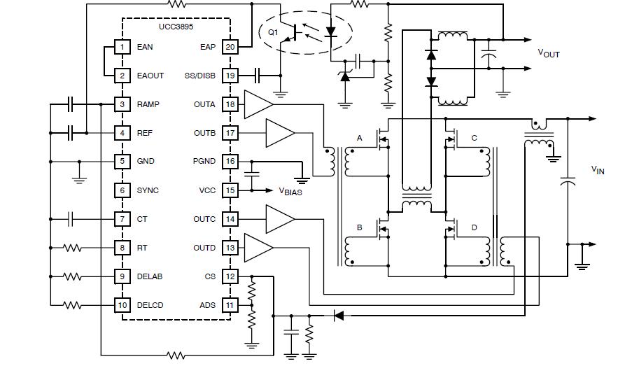 UCC2895DW absolute maximum ratings: (1)Supply voltage (IDD < 10 mA): 17 V; (2)Supply current: 30mA; (3)Reference current: 15 mA; (4)Output crrent: 100mA; (5)Analog inputs EAP, EAN, EAOUT, RAMP, SYNC, ADS, CS, SS/DISB --0.3 V to REF+0.3 V; (6)Drive outputs OUTA, OUTB, OUTC, OUTD: -0.3 V to VCC + 0.3 V; (7)Power dissipation at TA= 25℃: 650 mW; (8)Storage temperature range, Tstg: -65 to 150℃; (9)Junction temperature range, TJ: -55 to 150℃; (10)Lead temperature 1,6 mm (1/16 inch) from case for 10 seconds: 300℃.